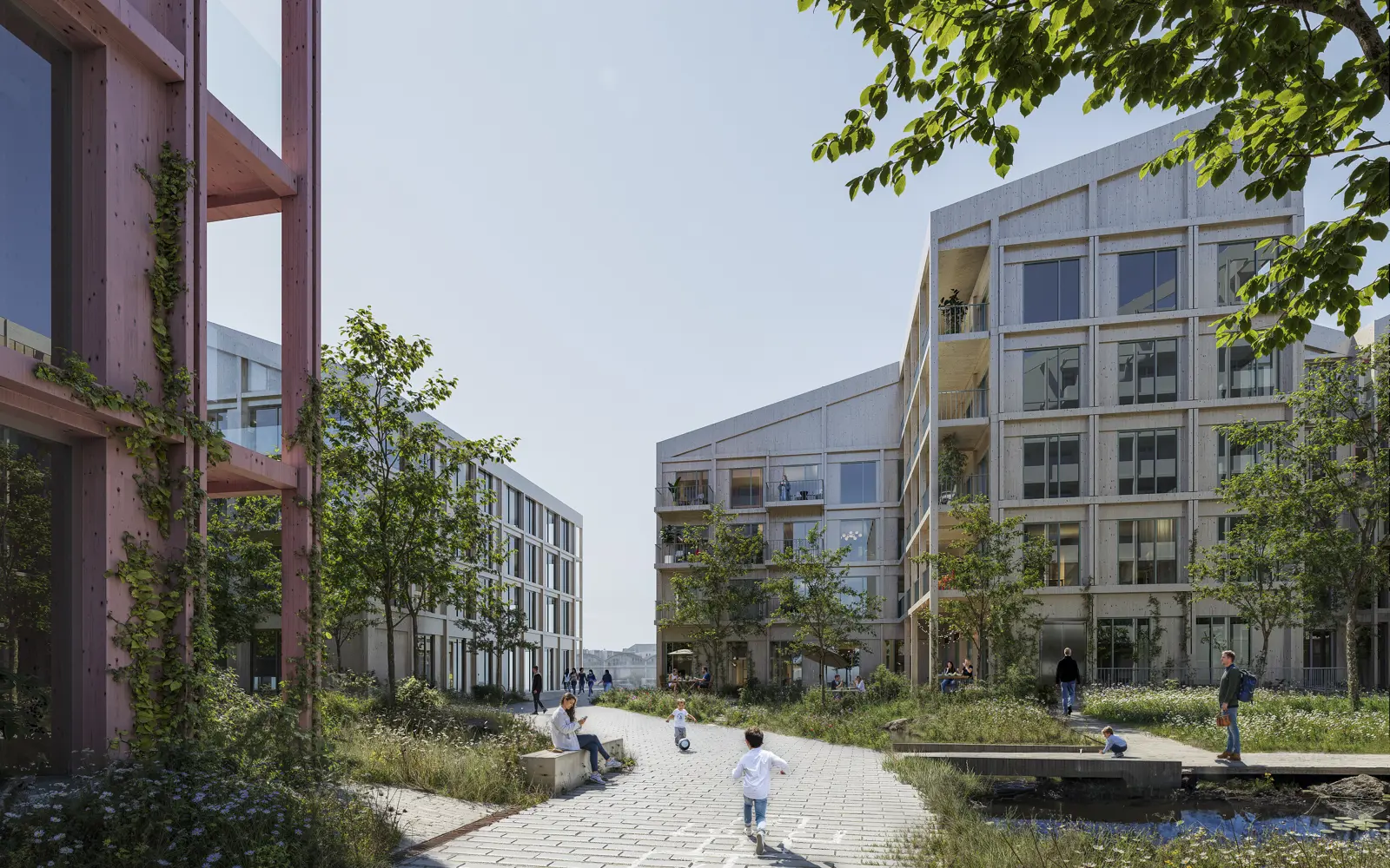 Arkitekturen har hentet inspirasjon fra både stedets industrielle historie og Trondheims ikoniske bryggerekker. Illustrasjonene viser varierte bygg i ulike størrelser som åpner seg mot vannkanten og grønne uterom.