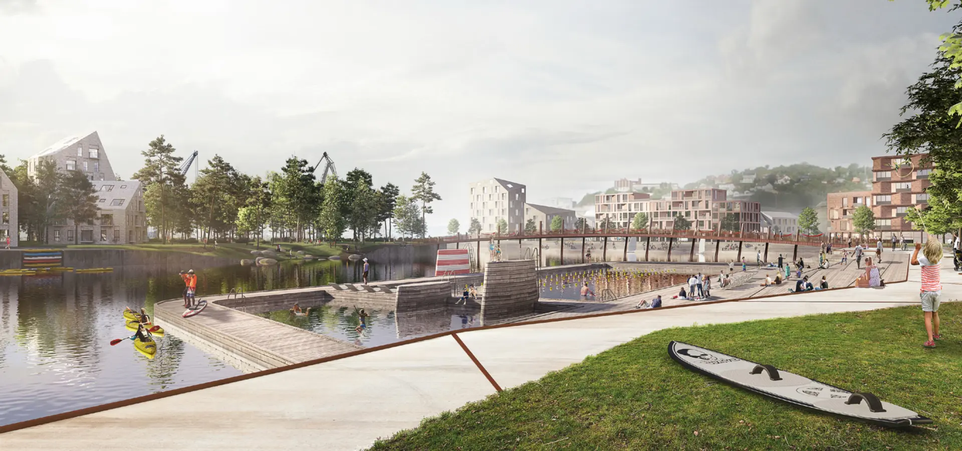 Illustrasjonen øverst på siden er utarbeidet av Team Skajaa i forbindelse med et parallelloppdrag i 2020. Den viser kun muligheter og ikke vedtatte planer for området. Her ser du Kullkranpiren med broforbindelse sett fra et fremtidig sjøbad hvor Havet Arena i dag ligger.