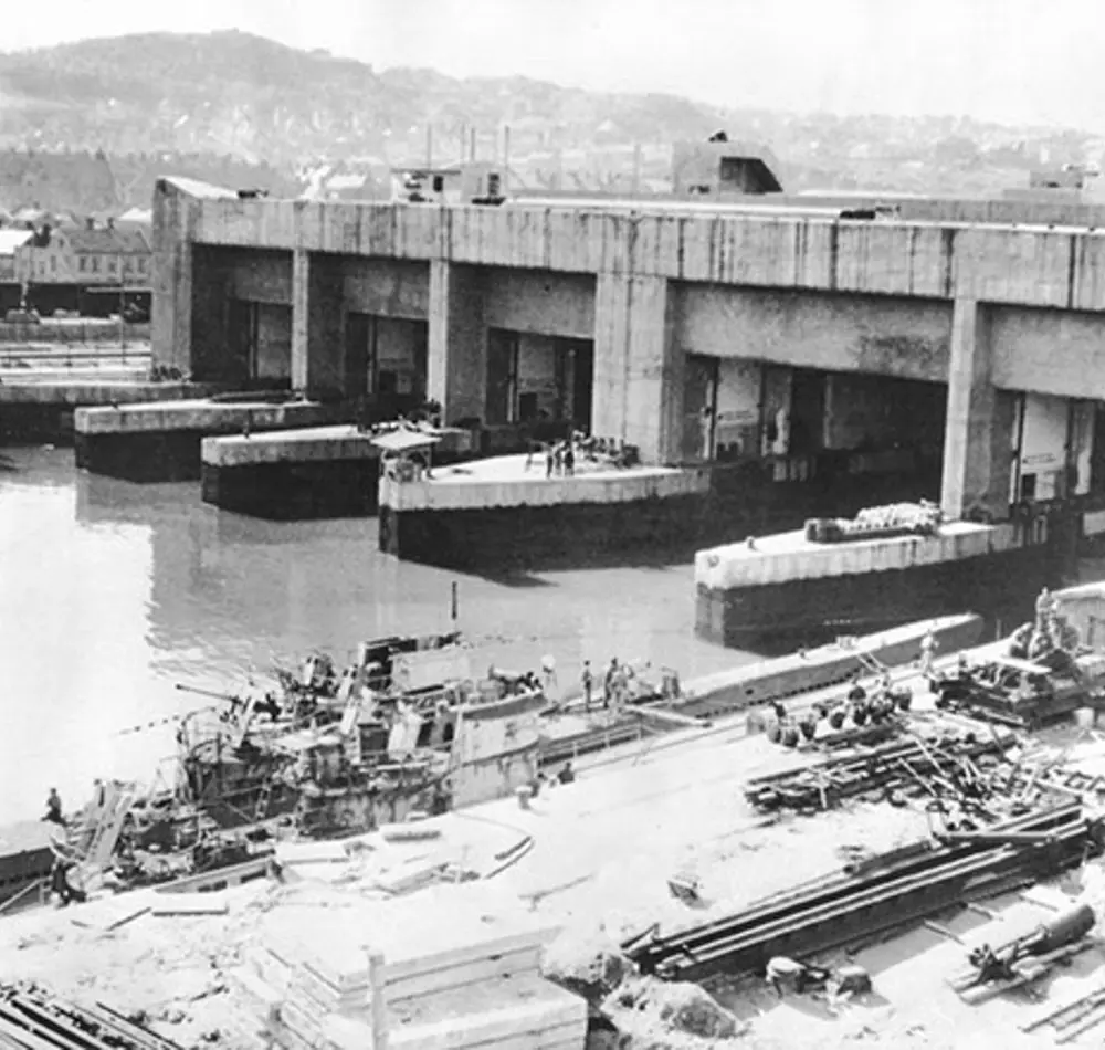 På Strandveikaia er det allerede verftsvirksomhet på dokken som er blitt fraktet fra England et par tiår tidligere. Tyskerne etablerer seg med hovedkvarter i Strandveien og setter i gang med planen om å bygge en trygg havn for sine krigsfartøy.